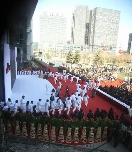 在现场可以看到,一个巨大的幕布从大厦西侧的顶楼垂下,上面印着百度数千名员工照片组成的笑脸,使过往的行人都感受到庆典仪式的喜庆氛围。仪式上,300名百度员工及百度爱好者们共同出演“百人秀”,通过跑动在大厦前的广场上排出一个个活泼生动的庆典图案,更将整个活动的气氛推向高潮。最后,李彦宏和员工及网友代表一起,在大厦前种下一棵象征基业长青的雪松,培上百度各地网友取来的五岳之土,并以长江、黄河之水浇灌。