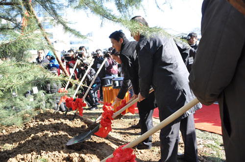 今天我们最亲爱的网友们为了表达他们对百度的祝福,不远千里送来了代表神州大地五岳之土和长江、黄河之水。山东网友前往泰山取土,送来东岳之土;陕西网友前往华山取土,送来西岳之土;湖南网友前往衡山取土,送来南岳之土;山西网友前往横山取土,取来北岳之土;河南网友前往嵩山取土,取来南岳之土;网友前往南京长江大桥,送来长江之水;山西网友前往黄河虎口瀑布取来黄河之水。下面让我们掌声有请北京市委常委、海淀区位书记赵凤桐先生;山西省省委常委、统战部部长李政文先生;山西省政协副主席卫小春先生;我们的董事长兼首席运营官、执行官李彦宏先生;首席财务官杰尼;技术首席执行官李一男;副总裁任旭阳一起前往植树区进行植树环节。有请。